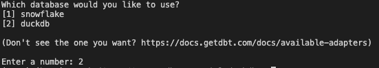 このコマンドを実行すると、対話形式でデータベース接続に関する質問が表示される場合があります。duckdbの番号を入力してEnterキーを押します。