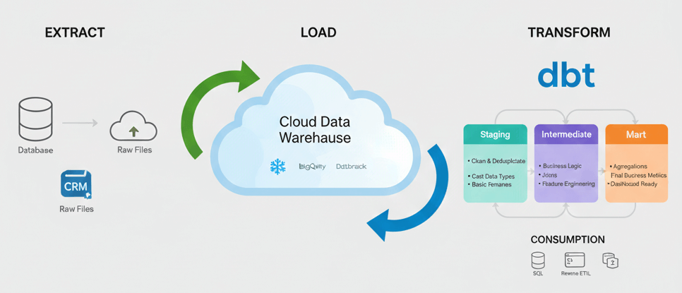 データ分析のプロセスは、ELT(Extract: 抽出、Load: 格納、Transform: 変換)という流れで進みます。dbtが専門とするのは、この中の「T」、つまりTransform(変換)の工程です。データウェアハウスに格納された生データ(RAWデータ)を、分析に適した信頼性の高いデータセットへと磨き上げる役割を担います。