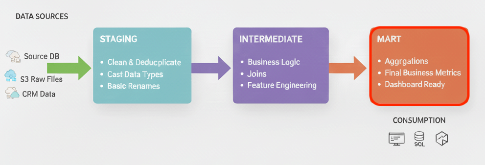 Mart層は、中間層で整備されたデータを組み合わせ、ビジネス部門が直接利用するための最終的なデータセットを構築します。