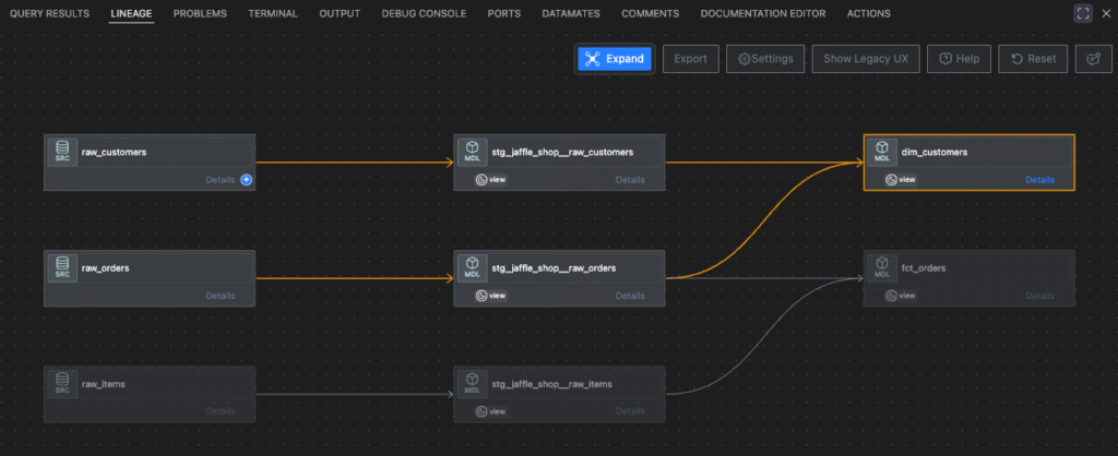 dbt buildコマンドを実行すると、ターミナルに実行ログが表示されます。そのログに注目してください。dbtがまずStaging層のモデル(stg_...)をビルドし、次にそれを参照しているfct_ordersとdim_customersをビルドするという、正しい順序で処理を進めていることが確認できるはずです。これは、dbtが内部でDAG(有向非巡回グラフ)を構築し、依存関係を解決しているおかげです。