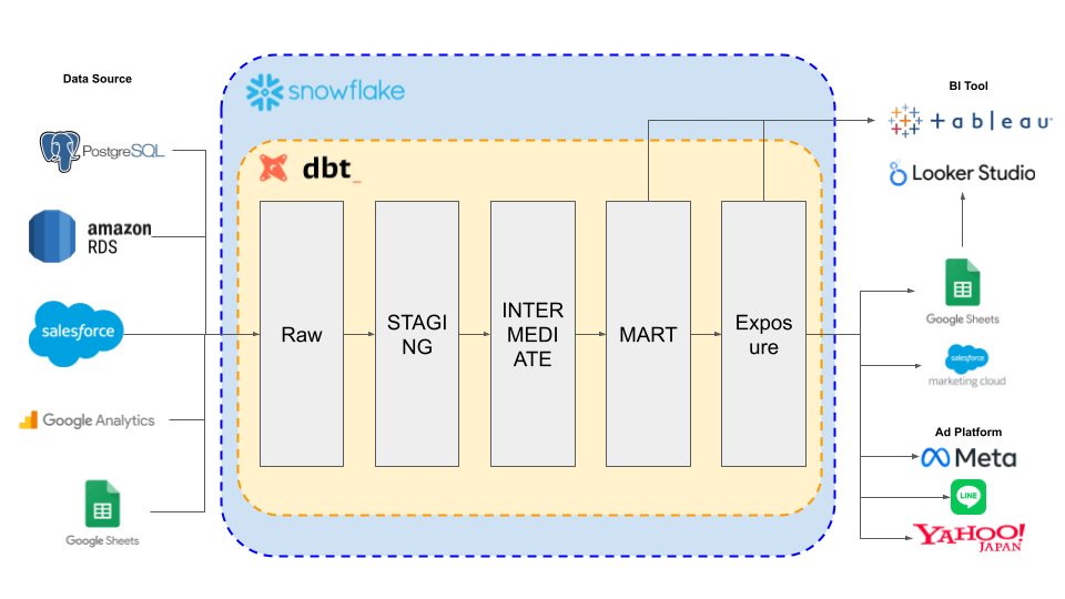 | ⑤ Exposure層 | 独自層 | Datamart | マートレイヤーのデータから、特定のビジネス要件に基づいて出力したデータ。BIツール連携特化やReverse ETL用など。 | agg_ / exp_ |